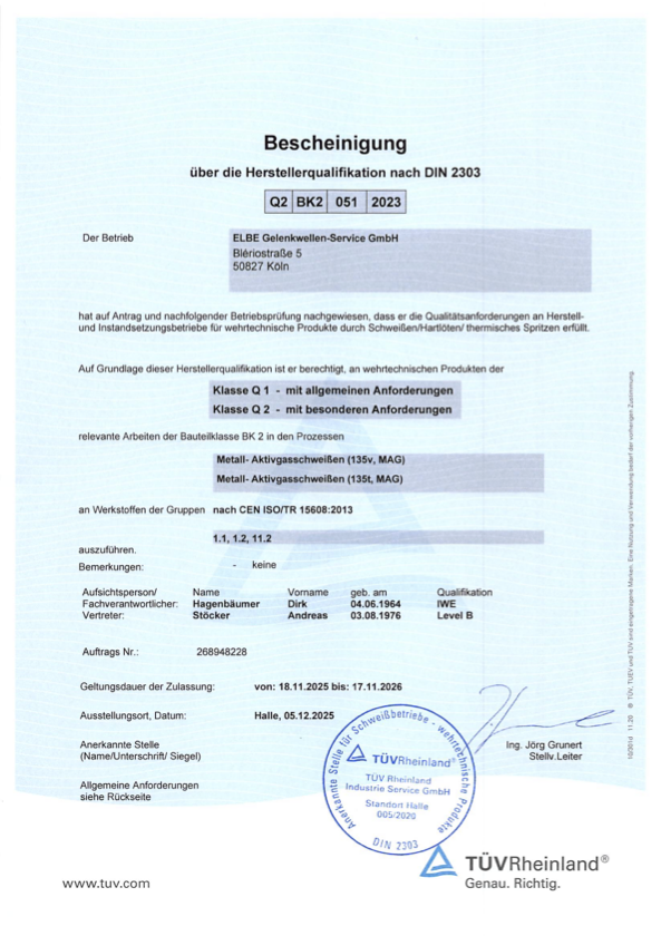 Seit Dezember 2006 ist unser Unternehmen entsprechend der Qualitätssicherungs-Norm ISO 9001 zertifiziert. Rezertifizierungen finden kontinuierlich statt. Außerdem ist ELBE Gelenkwellen-Service GmbH Ihr Partner für Schweißarbeiten von Schienenfahrzeugen- und -fahrzeugteile.